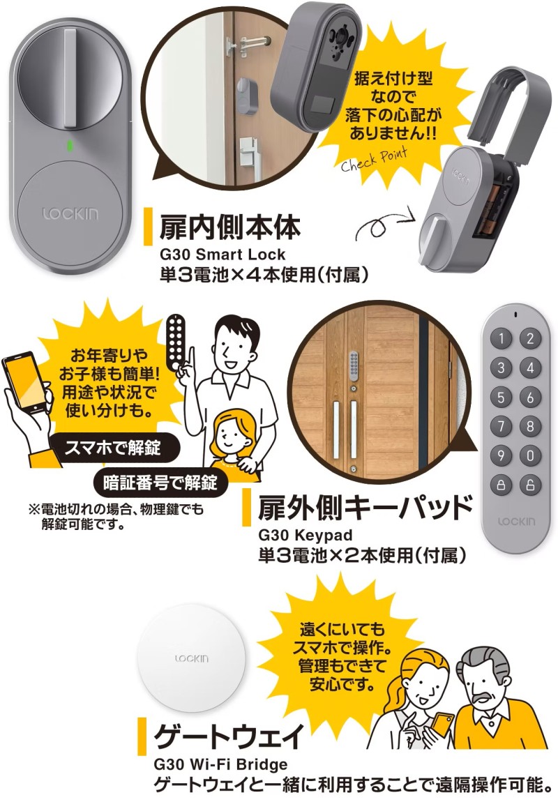 ● パッケージ内容:扉内側本体(G30 Smart Lock)、扉外側キーパッド(G30 Keypad)、Wi-Fiブリッジ (G30 Wi-Fi Bridge 2.4Ghz)、各種ネジ